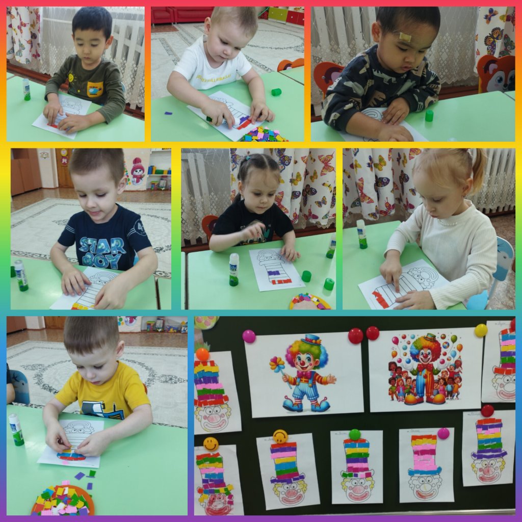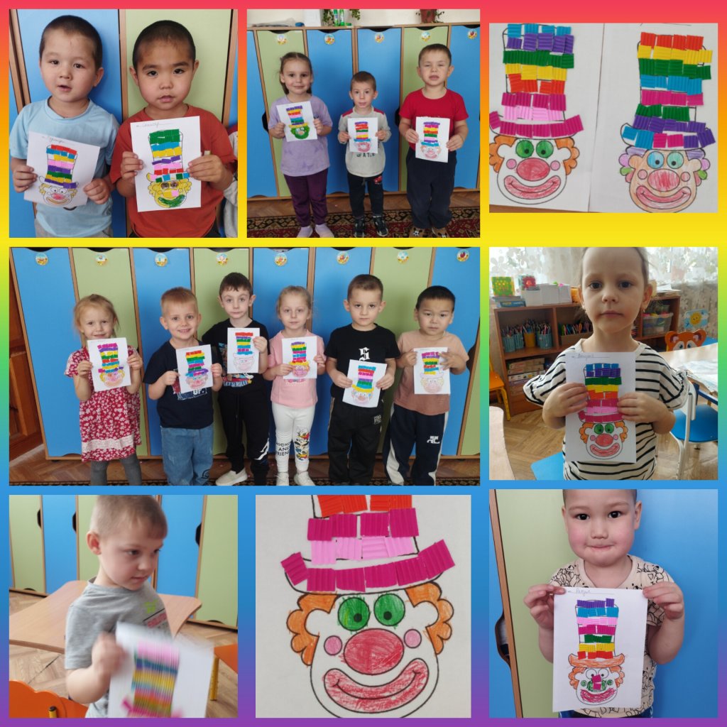 Сабақ барысында балалар клоун бейнесі арқылы – жарқын, мейірімді, көңілді, кейде таң қалған немесе ойға шомған сезімдермен танысты. Балалар жамаулардың түстерін таңдап, клоунның көңіл-күйін талқылап, ол қандай эмоцияларды бастан кешіре алатынын және өздерінің не сезінетінін бөлісті.