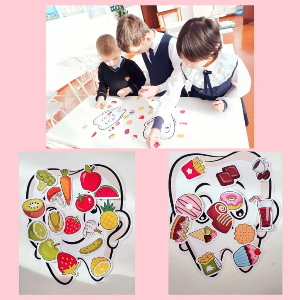 Көрнекі және дидактикалық материалға сүйене отырып, оқушылар гигиеналық құралдар мен денсаулықты сақтау үшін орындау керек гигиеналық процедуралар туралы айтты. Олар «Ауру және сау тіс» шығармашылық жұмысына қатысып, тек пайдалы ғана емес, зиянды тағамдарды да пайдаланғанды ұнататынын жазып, «Денсаулықты қалай сақтауға болады?» атты жадынама құрастырды.